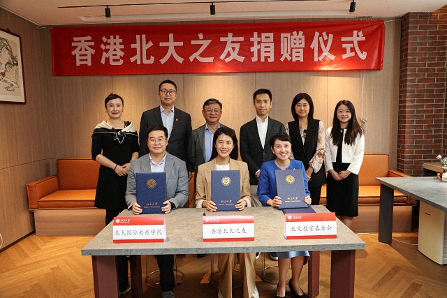 On September 27, 2024, the donation ceremony by the Alumni Association of Peking University (Hong Kong) was held at the Bocheng Café (Bocheng Café) of the School of International Studies (SIS), PKU. Guests in attendance included Chen Shangzhi (Director of the Alumni Association of Peking University (Hong Kong), Honorary Trustee of PKU) and his wife Yu Anni, Wang Lu (Alumni Association of PKU (Hong Kong)), Geng Shu (Deputy Secretary-General of the Peking University Education Foundation), and Chen Shangjun (Program Manager, Asia Affairs Department, Peking University Education Foundation). From SIS, attendees included Tang Shiqi (Dean, SIS, PKU), Xiang Zuotao (Deputy Secretary of the CPC Committee, SIS), and Jin Rui (Deputy Director of the Alumni Office, SIS). The ceremony was hosted by Zhang Xinyang (Deputy Secretary of the CPC Committee, SIS).