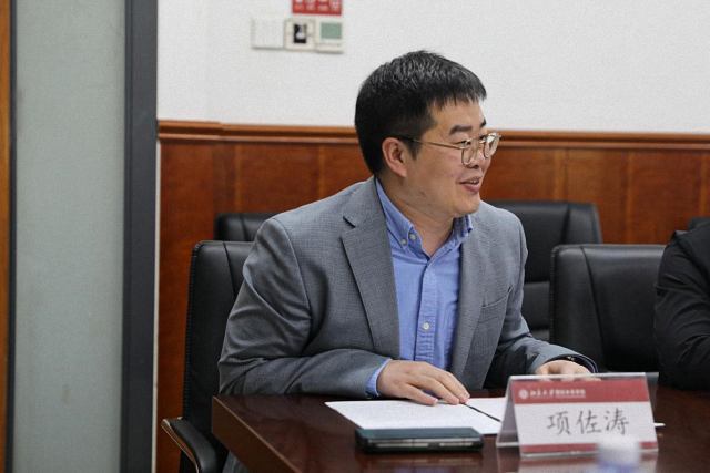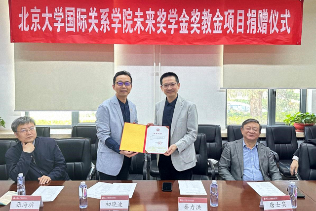 On the morning of April 29, 2023, the donation ceremony for the Future Scholarship and Teaching Award was held in Room B117 of the School of International Studies (SIS), Peking University. Alumni representatives Mr. Qin Lihong (Co-founder of NIO), Mr. Zhou Qiangwu (Vice President and CEO of the New Development Bank), and Mr. Wang Yong (Deputy Secretary-General of the Peking University Education Foundation) attended the ceremony. The School was represented by Dean Prof. Tang Shiqi, Party Secretary Prof. Chu Xiaobo, Vice Dean Prof. Zhang Haibin, Deputy Party Secretaries Prof. Zhu Yibo and Prof. Xiang Zuotao, Assistant Dean and Director of the Alumni Office Prof. Zhang Xinyang, and Deputy Director of the Alumni Office Ms. Jin Rui. The ceremony was chaired by Prof. Xiang Zuotao.