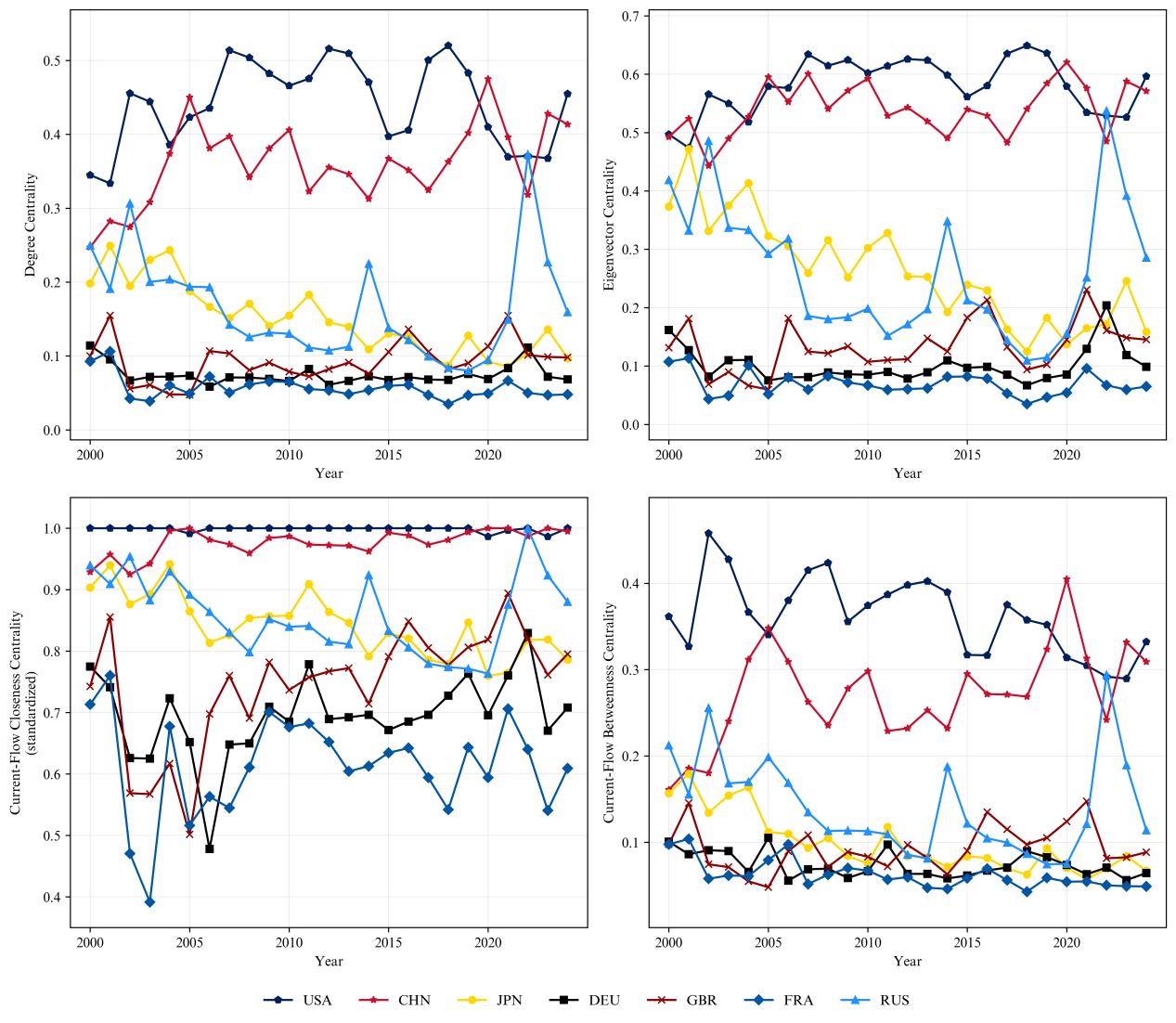 过去四分之一世纪里,二十国集团(G20)成员国间的国际经济合作的网络结构如何演变?不同国家在该网络中扮演着怎样的角色,又拥有何种权力水平?在收集2000至2024年G20国家间经济合作事件大数据的基础上,运用结构变点检测算法将这25年划分为四个时期,分别构建国际经济合作网络。基于网络分析,计算并比较了G20经济合作网络与贸易网络的多维特征。在宏观网络结构层面,发现G20国家间贸易关系日益紧密的同时,经济合作却呈现疏离趋势。在中观群体分类层面,G20经济合作网络与贸易网络的社区发现结果以及边权重差异分析呈现出鲜明但不同的区域特征。在微观权力分布层面,运用基于电流模型和随机游走的加权中心性指标,测量并比较了G20国家在经济合作网络中的权力水平及其消长。通过结合网络分析与事件大数据,以区别于传统的使用贸易额或制度数据(如自由贸易协定)的研究路径,深入剖析国家间的经济互动关系。